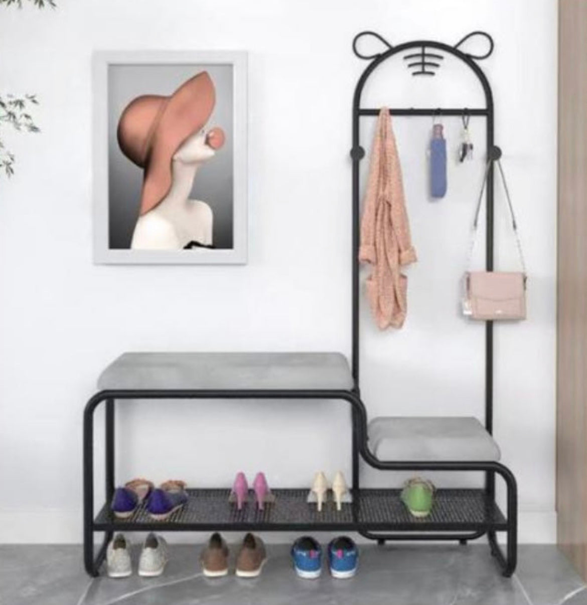 Discover the perfect addition to your home entrance with this unique footstool! It features shelves perfect for shoes, plus hangers for your bag and coats. Available in two striking frame colors: black and gold metal.