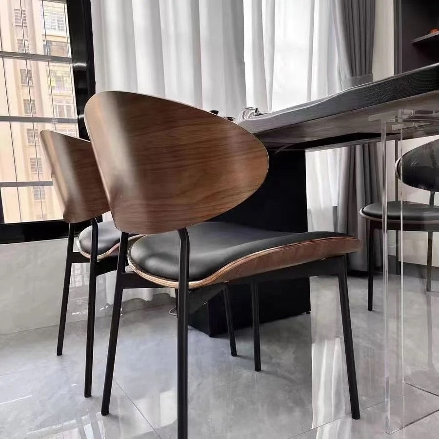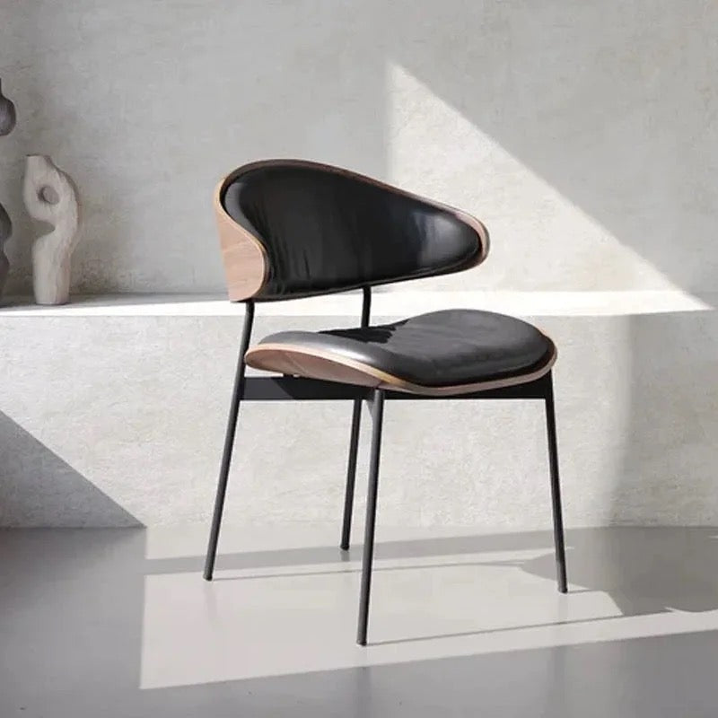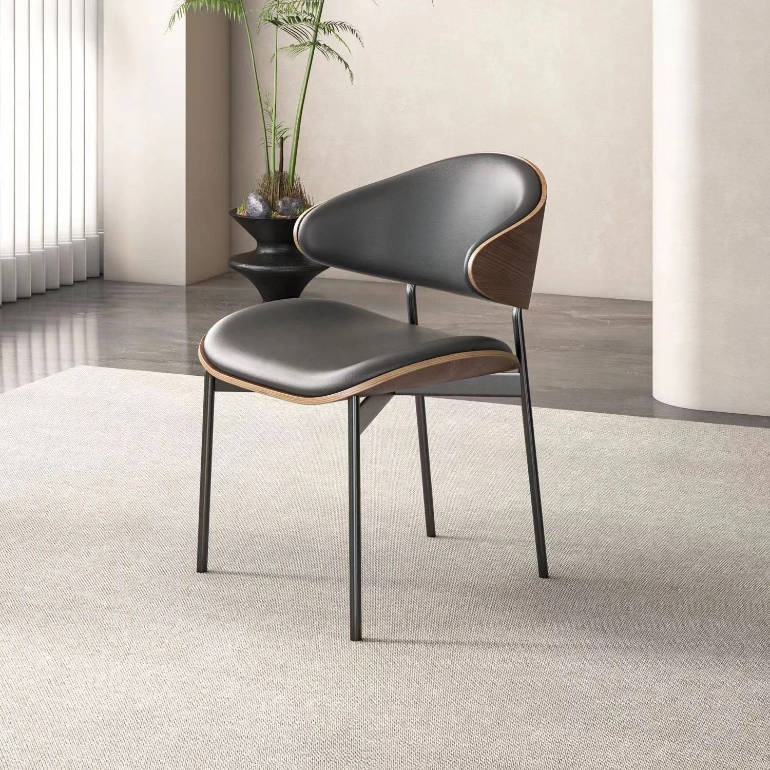 With its sturdy black metal legs, this chair adds a sophisticated touch to any dining room, office, or living space. The carefully crafted wood grain finish on the back and sides adds a natural warmth to its modern profile, making it a versatile piece that complements various interior styles.