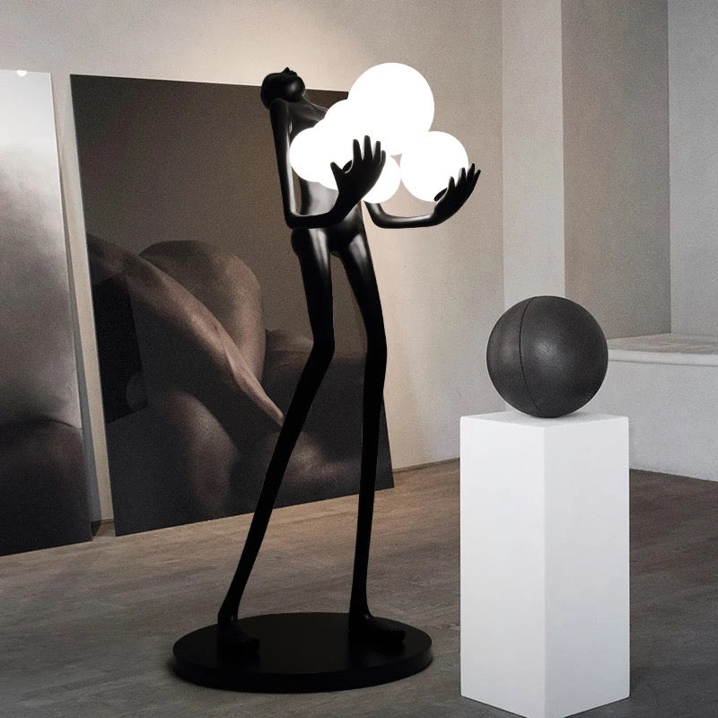 The Body Sculpture Lamp made of Resin and Glass in black color is a freestanding Floor Lamp. The lamp features a body sculpted out of resin 1800mm Tall, which is a durable and versatile material that can be molded into various shapes and designs. The body of the lamp is black in color, giving it a sleek and modern look.