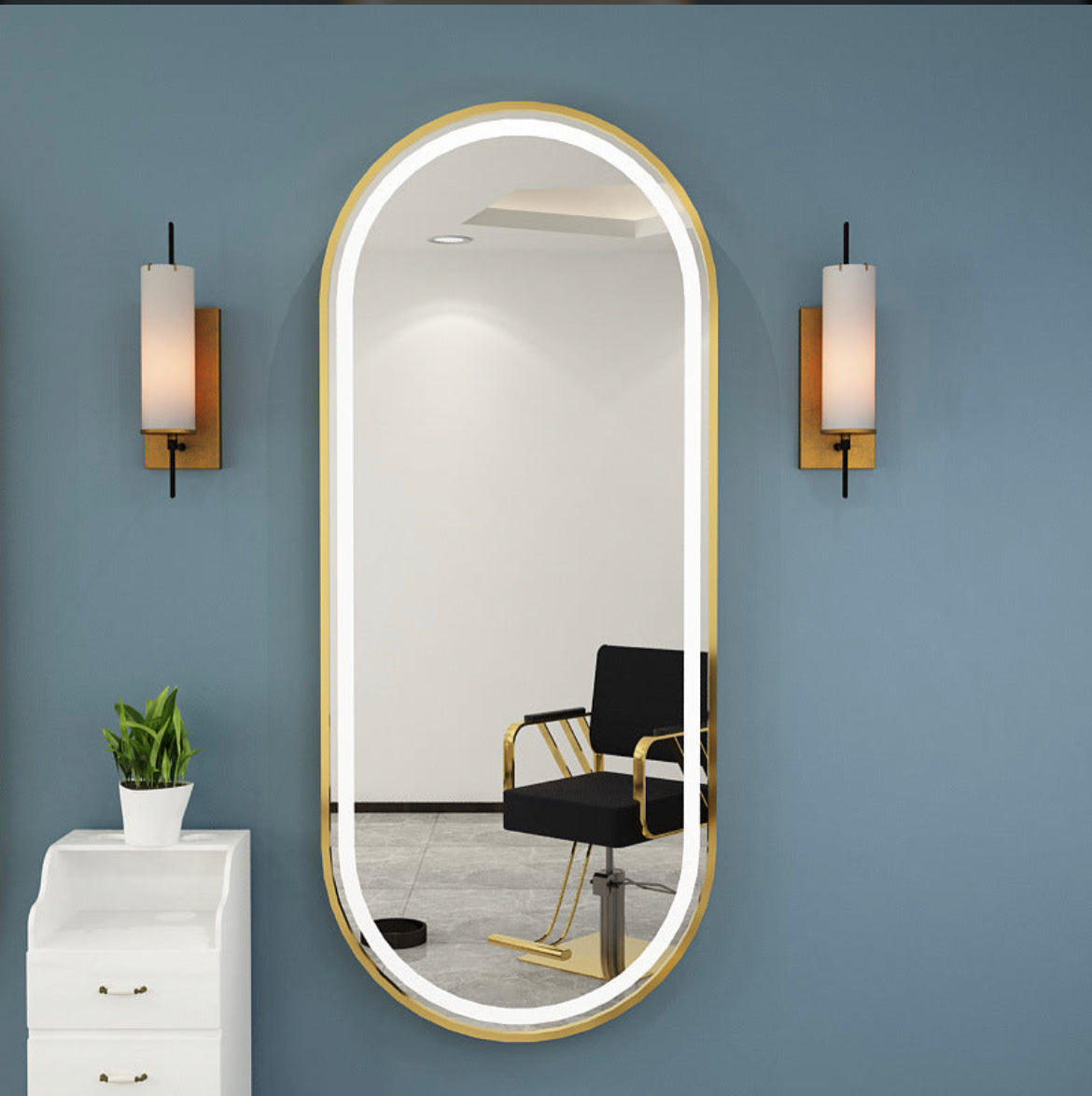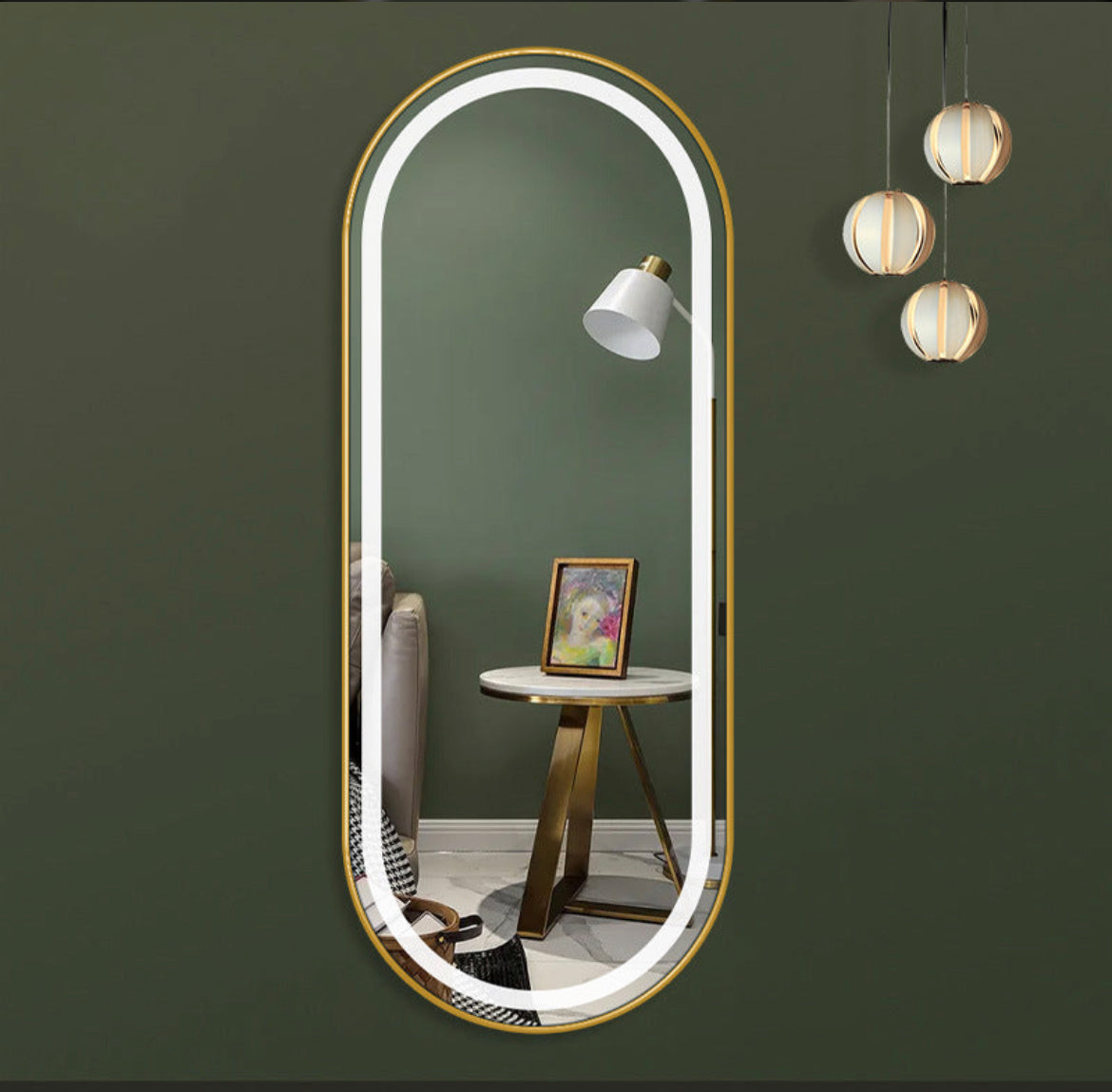 Amp up your space with this dazzling GOLD FRAME Oval Mirror, glamorously framed and featuring built-in LED lighting. This classic design will add serious style to any area! Frame material: aluminium SIZE: 150X50 CM
