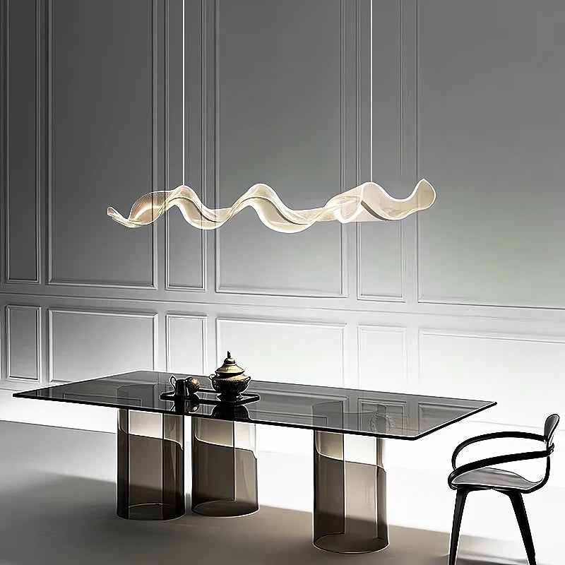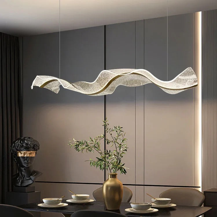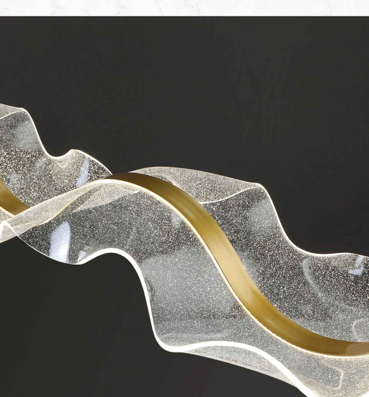 Introducing our stunning Ceiling daining Chandelier Light, an epitome of modern elegance and sophisticated design. This chandelier features an intricate wave-like structure, crafted from high-quality acrylic with embedded dots that create a unique and mesmerizing light effect. The undulating form is accentuated with a blend of transparent and golden elements, creating a dynamic visual effect that enhances any interior space.